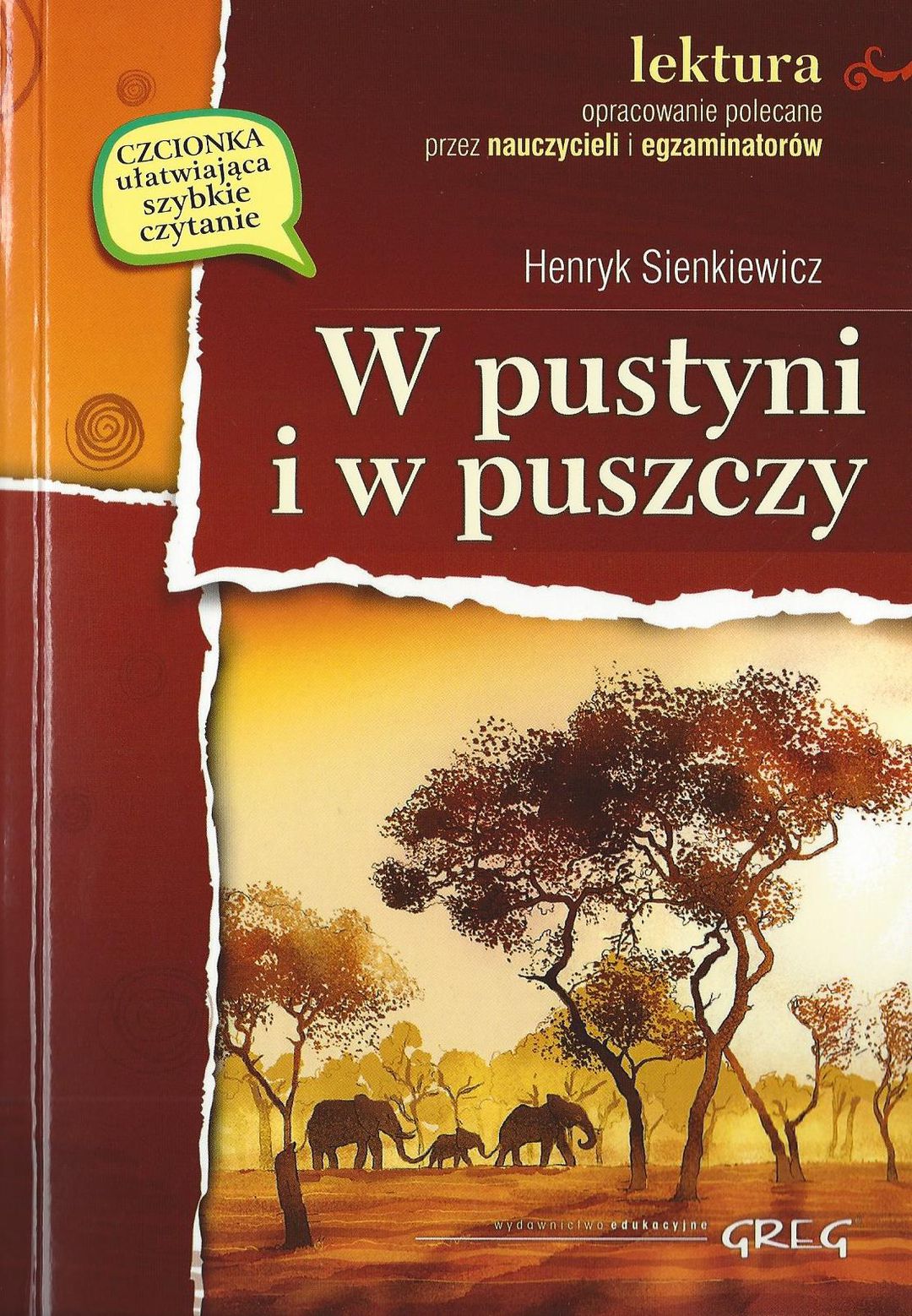 „W pustyni i w puszczy” przedstawia przygody dwójki dzieci: czternastoletniego Stasia Tarkowskiego i ośmioletniej Nel Rawlison, porwanych przez Beduinów. Dzięki sprytowi Stasia udaje im się umknąć porywaczom, lecz muszą samotnie pokonać długą i ciężką drogę do El-Fajum, w towarzystwie Murzyna ' Kalego oraz opiekunki Nel ~ Mei. W czasie drogi bohaterowie przeżywają bardzo wiele przygód, zamieszkują w drzewie, ratują życie słoniowi, który staje się ich przyjacielem. Nel choruję na febrę, lecz dzięki pomocy Stasia udaje jej się wyzdrowieć. Dzięki puszczanym latawcom dzieci zostają odnalezione przez angielskich oficerów, którzy pomagają im odnaleźć zaniepokojonych ojców. Powieść bogata jest w opisy zarówno postaci, jak i miejsc. Mimo że czytam ją już któryś raz z kolei, książka cały czas trzyma mnie w napięciu i nie sposób się od niej oderwać. Napisana jest językiem jasnym i przystępnym, dla młodego pokolenia czytelników. Wydawnictwo Greg zadbało również o specjalną czcionkę, która ułatwia dzieciom czytanie. Egzemplarz, który posiadam, zawiera również opracowanie, polecane przez nauczycieli i egzaminatorów. Publikacja wzbogacona jest kilkoma czarno-białymi rysunkami. Naprawdę wydanie solidne książka godna polecenia. [lubimyczytac.pl]