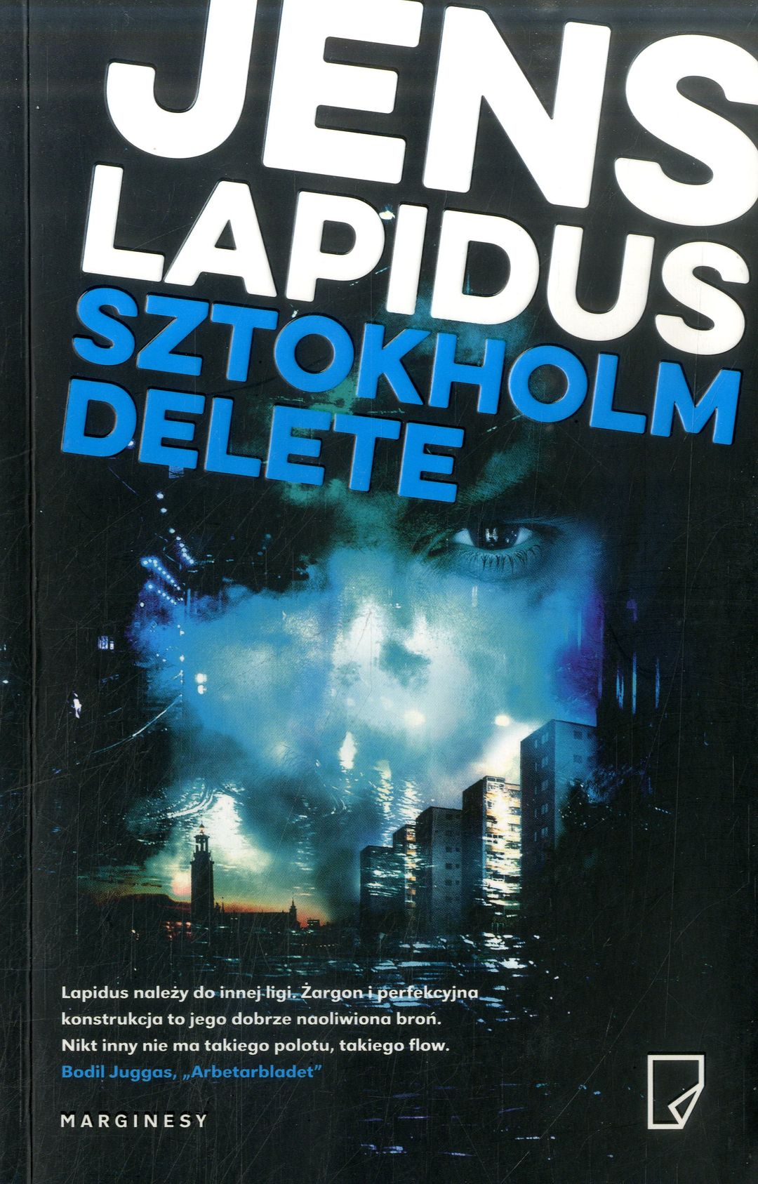 U dołu okładki: Lapidus należy do innej ligi. Żargon i perfekcyjna konstrukcja to jego dobrze naoliwiona broń. Nikt inny nie ma takiego polotu, takiego flow. Bodil Juggas, "Arbetarbladet".